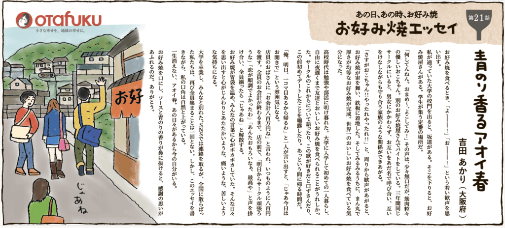 お好み焼きにまつわる心温まる作品に、オキデザインの沖氏がイラストで色を添えています。