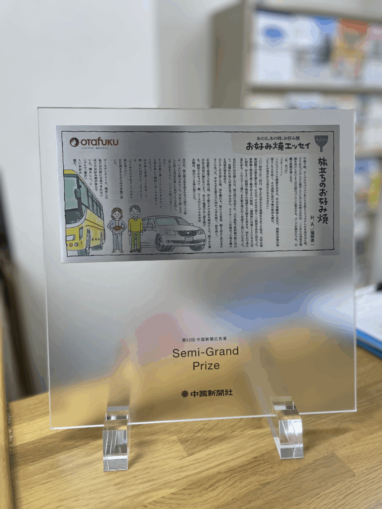 25回を迎える「あの日、あの時、お好み焼」お好み焼エッセイが、中国新聞広告賞 準グランプリを獲得しました。本企画は、2022年に創業100周年を記念して発行されたエッセイ集で投稿された作品から選出させていただき、毎月第3月曜日発行の中国新聞セレクトに掲載しています。